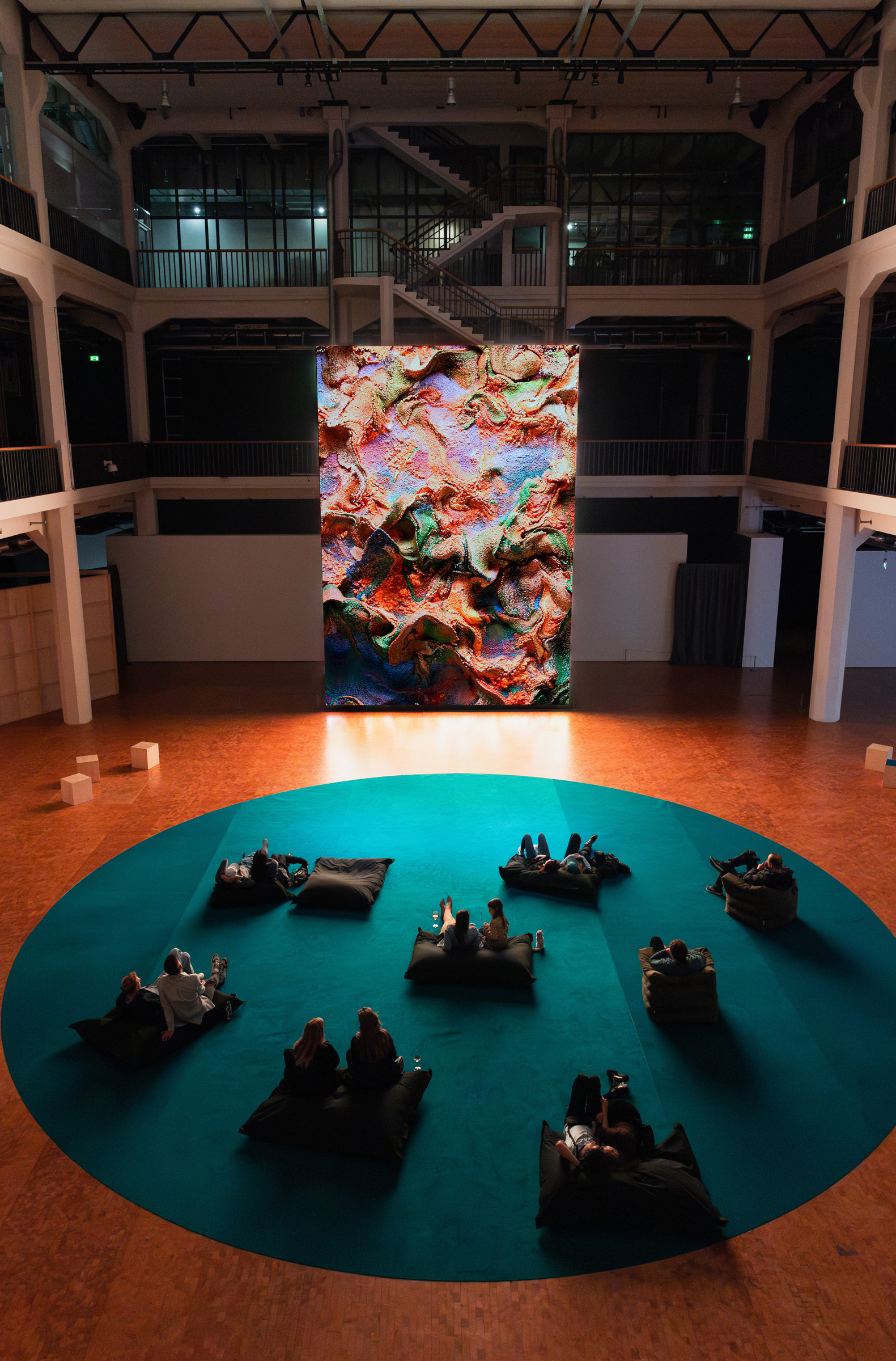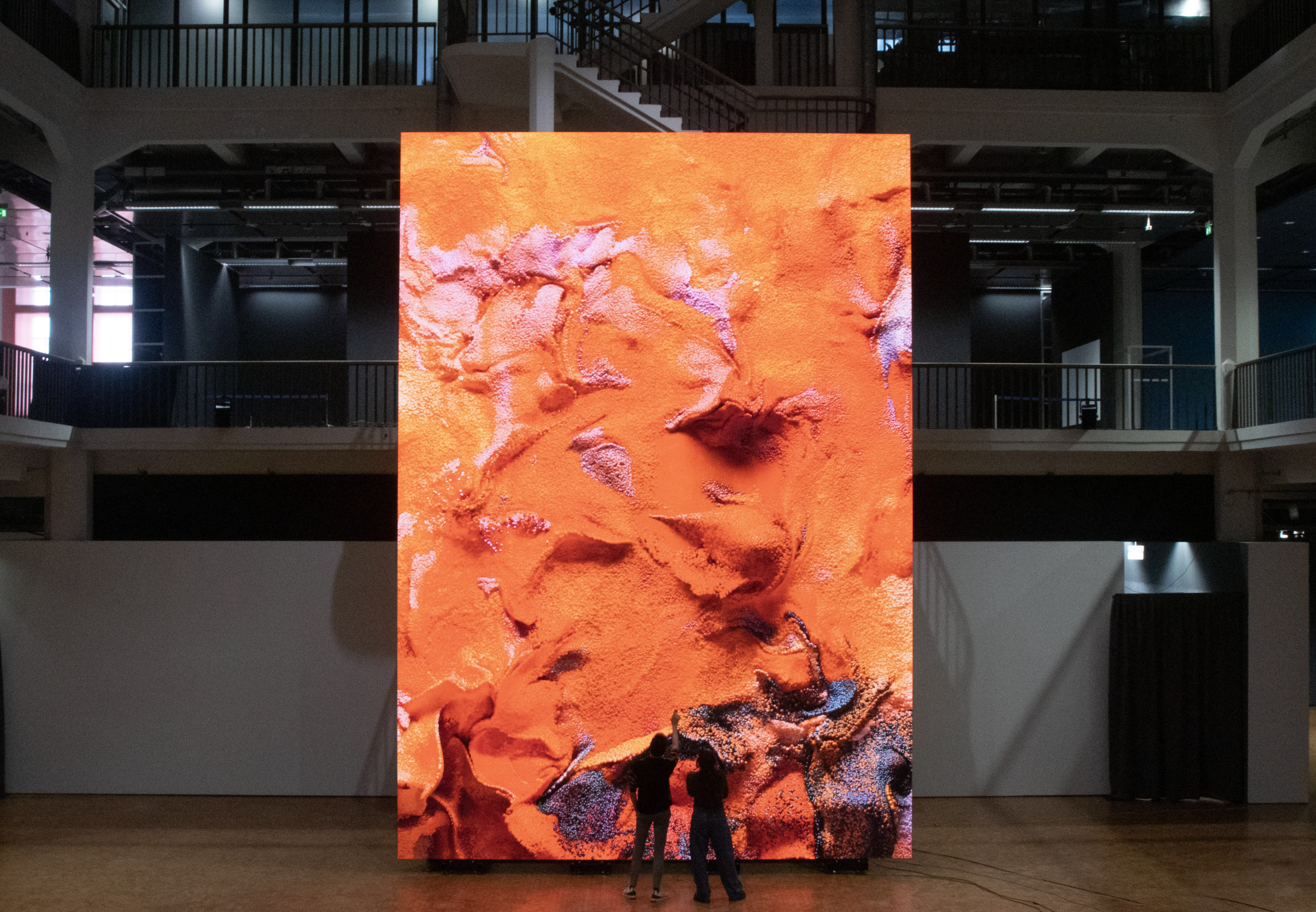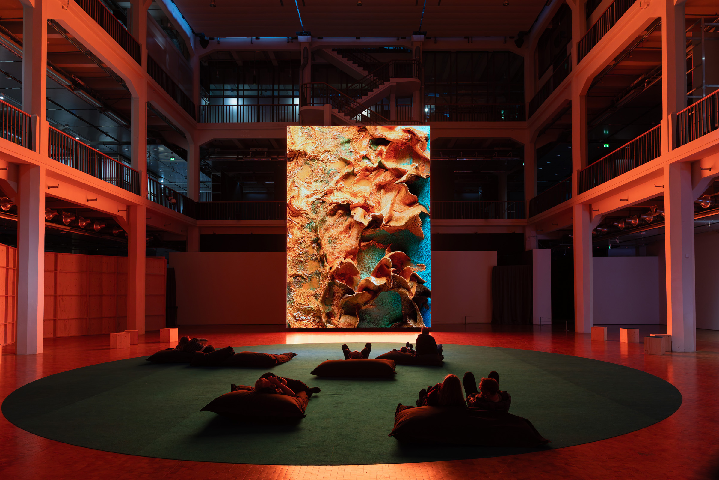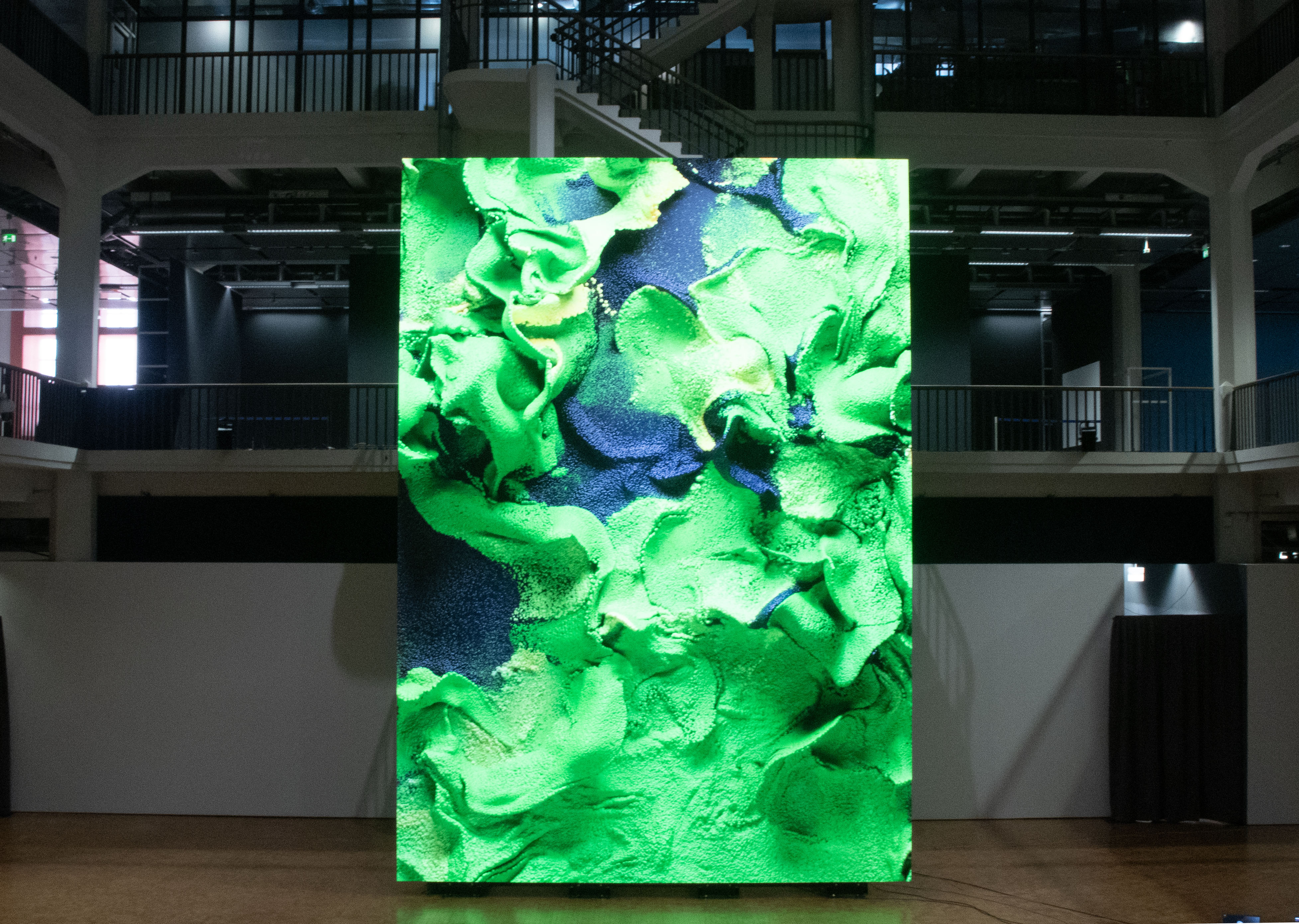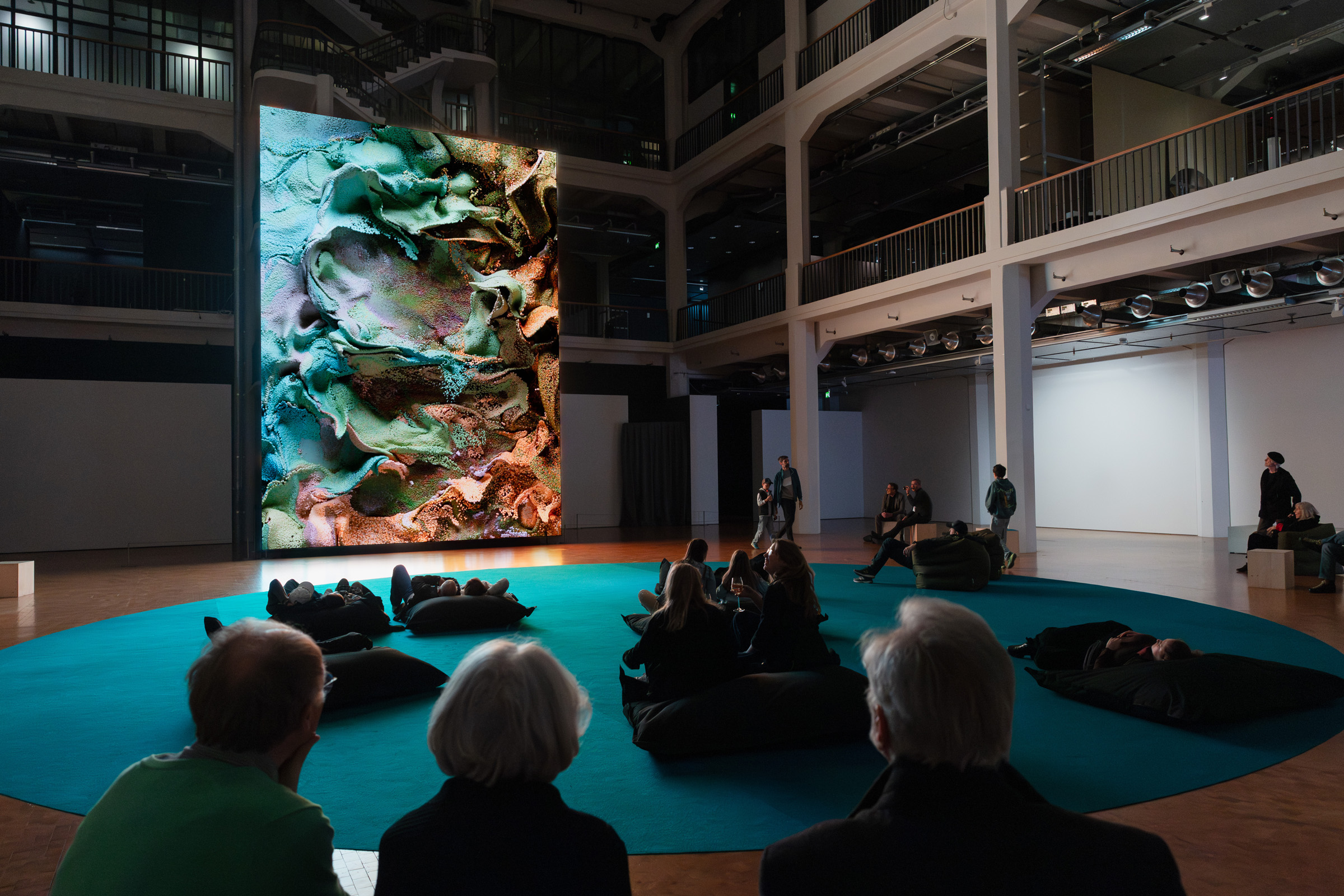 Für sechs Wochen wird der Lichthof 8 des ZKM | Karlsruhe zu einem Ort, an dem man Kunst erleben und Zeit miteinander verbringen kann. Im Zentrum steht eine 8,5 × 6 Meter große, über zwei Stockwerke reichende LED-Wand, auf der im Zwei-Wochen-Takt drei künstlerische Positionen zu sehen sind, die sich aus unterschiedlichen Perspektiven mit Künstlicher Intelligenz befassen.